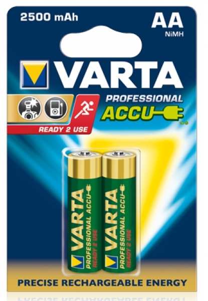 Battery Battery type Rechargeable battery Battery size AA Battery technology Nickel-Metal Hydride (NiMH) Battery voltage 1.2 V Number of batteries included 2 pc(s) Battery capacity 2500 mAh Battery capacity type High Product colour Gold,Green Weight & dimensions Weight 30 g Packaging data Package type Blister