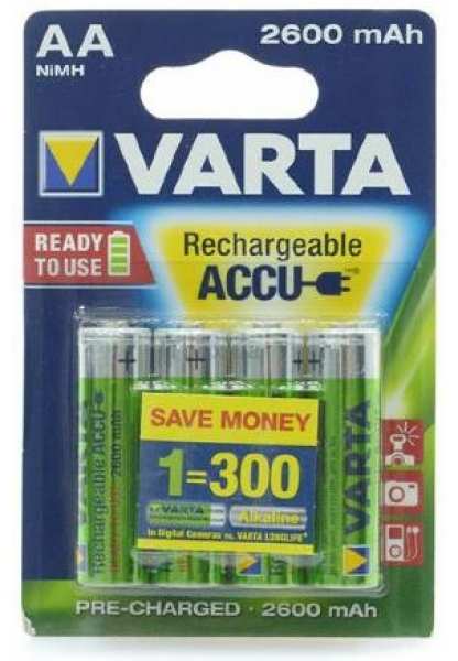 Varta Rechargeable ACCU AA 2600mAh. Battery type Rechargeable battery, Battery technology Nickel-Metal Hydride (NiMH), Battery voltage 1.2 V. Package type Blister. Cylindrical battery size AA