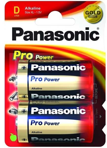 Panasonic 1x2 LR20PPG. Battery type Single-use battery, Battery technology Alkaline, Battery voltage 1.5 V. Width 33.6 mm, Depth 33.6 mm, Height 61.5 mm. Type D - XL