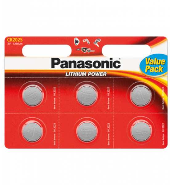 Tecxus CR2025 P 6-BL Panasonic. Battery type Single-use battery, Battery size CR2025, Battery technology Lithium. Height 2.5 mm, Diameter 2 cm. Battery form factor Button/coin, Dimensions (WxDxH) 20 x 20 x 2.5 mm