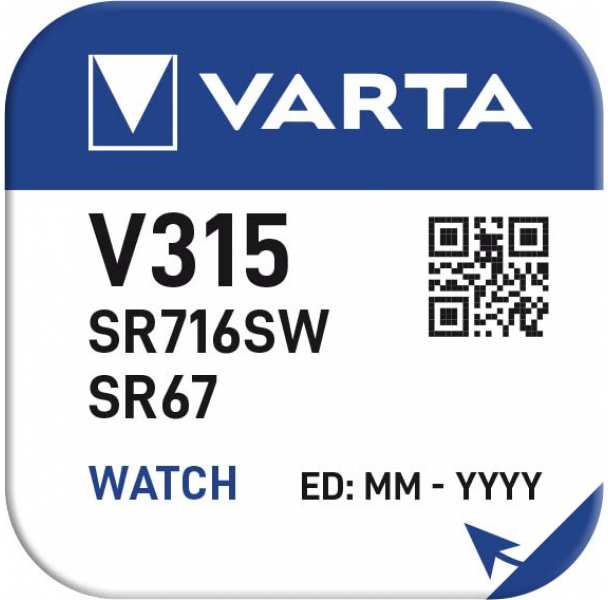 Varta V315. Battery type Single-use battery, Battery technology Silver-Oxide (S), Battery voltage 1.55 V. Battery form factor Button/coin, Shape Round