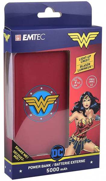 The crest light up when you shake the powerbank 5 000 mAh power banks to keep your devicescharged the whole day Most famous DC Comics crests Ultra-thin design with 4 LED charge indicator Comes pre-charged 2 port USB-A (out) 1 port micro-USB (in)