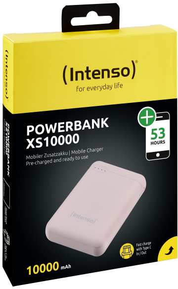 Intenso XS10000. Battery capacity 10000 mAh, Battery technology Lithium Polymer (LiPo). USB A output ports 1, USB Type-C ports quantity 1. Output current 3.1 A. Product colour Rose
