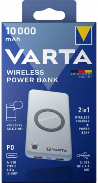 Varta 57913. Battery capacity 10000 mAh, Battery technology Lithium Polymer (LiPo), Fast charging technology Quick Charge 3.0, Battery voltage 3.7 V. USB A output ports 2, USB Type-C ports quantity 2. Wireless charging. Total output power 18 W. Product colour White