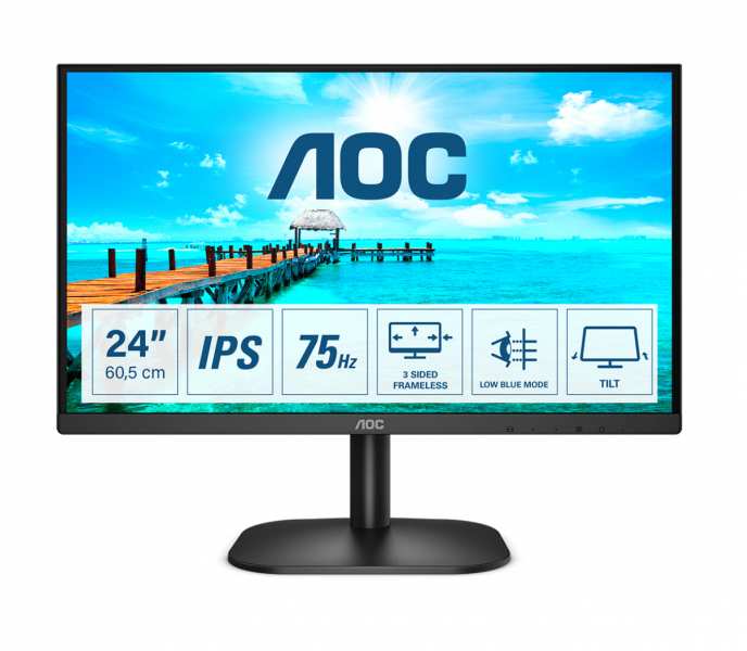 AOC B2 24B2XH. Display diagonal 60.5 cm (23.8), Display resolution 1920 x 1080 pixels, HD type Full HD, Display technology LED, Response time 7 ms, Native aspect ratio 169, Viewing angle, horizontal 178°, Viewing angle, vertical 178°. Product colour Black