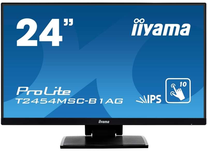 iiyama T2454MSC-B1AG, ProLite. Display diagonal 60.5 cm (23.8), Response time 4 ms, Display brightness 250 cd/m². Product colour Black, International Protection (IP) code IPX1. Touch technology Multi-touch, Touchscreen type Multi-user, Megapixel 2.1 MP. Cables included AC,HDMI,USB,VGA, Audio input 3.5mm. Tilt angle range -5 - 90°, Panel mounting interface 100 x 100 mm, Placement supported Horizontal/Vertical