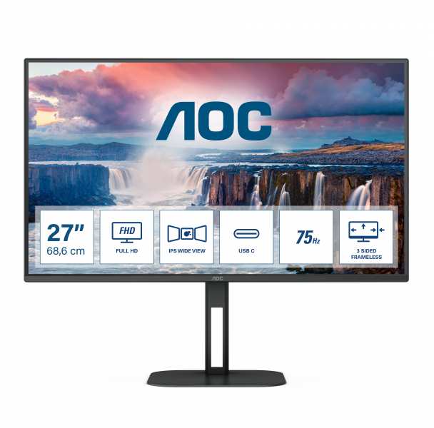 AOC V5 27V5CE. Display diagonal 68.6 cm (27), Display resolution 1920 x 1080 pixels, HD type Full HD, Display technology LED, Response time 1 ms, Native aspect ratio 169, Viewing angle, horizontal 178°, Viewing angle, vertical 178°. Built-in speaker(s). Built-in USB hub, USB hub version 3.2 Gen 1 (3.1 Gen 1). VESA mounting. Product colour Black