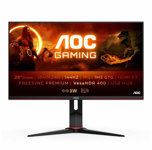 AOC G2 U28G2XU2/BK. Display diagonal 71.1 cm (28), Display resolution 3840 x 2160 pixels, Response time 1 ms, Native aspect ratio 169, Viewing angle, horizontal 178°, Viewing angle, vertical 178°. Built-in speaker(s). Built-in USB hub. Height adjustment. Product colour Black, Red