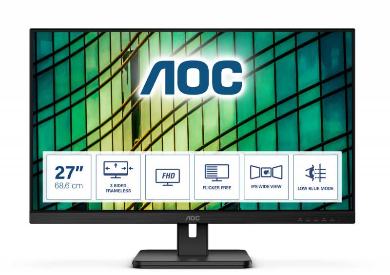 AOC E2 27E2QAE. Display diagonal 68.6 cm (27), Display resolution 1920 x 1080 pixels, HD type Full HD, Display technology LCD, Response time 4 ms, Native aspect ratio 169, Viewing angle, horizontal 178°, Viewing angle, vertical 178°. Built-in speaker(s). VESA mounting. Product colour Black