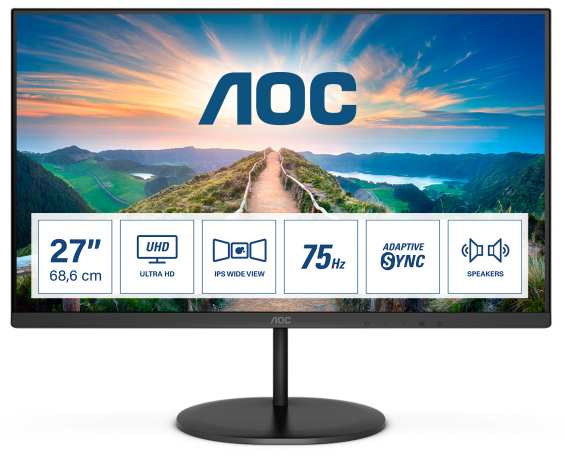 AOC V4 U27V4EA. Display diagonal 68.6 cm (27), Display resolution 3840 x 2160 pixels, HD type 4K Ultra HD, Display technology LED, Display surface Matt, Response time 4 ms, Native aspect ratio 169, Viewing angle, horizontal 178°, Viewing angle, vertical 178°. Built-in speaker(s). VESA mounting. Product colour Black