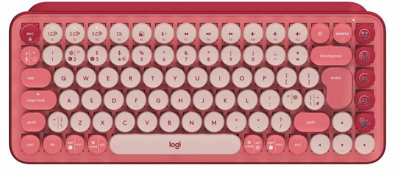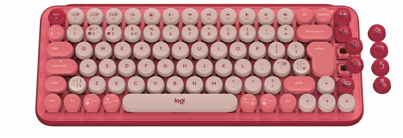Logitech POP Keys Wireless Mechanical Keyboard With Emoji Keys. Keyboard form factor Mini. Keyboard style Straight. Device interface RF Wireless + Bluetooth, Keyboard key switch Mechanical, Keyboard layout QWERTZ, Recommended usage Universal. Product colour Burgundy, Pink, Rose