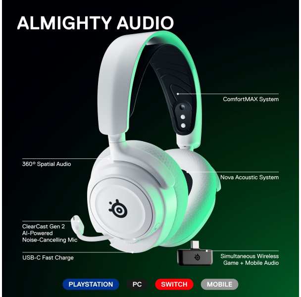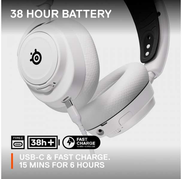 SteelSeries Arctis Nova 7X gaming headset white/black. The headphones are equipped with high-precision, powerful drivers that, together with 360° spatial audio, ensure impressive, immersive sound. They are multiplatform capable and can be connected to end devices at the same time via the USB-C dongle and Bluetooth. The ComfortMAX system with adjustable ear cushions and memory foam ear cushions ensures that you can play for hours and the headset always remains comfortable - and so that you can play all night long, the battery lasts up to 38 hours.