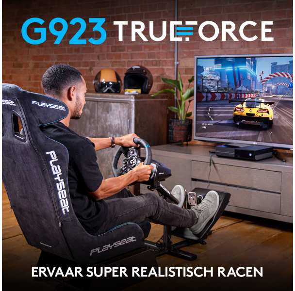 Logitech G G923 Racing Wheel and Pedals for Xbox X|S, Xbox One and PC. Device type Steering wheel + Pedals, Gaming platforms supported PC, Xbox 360, Steering wheel rotation angle 900°. Connectivity technology Wired, Device interface USB. Product colour Black, Pedals box material Cold rolled steel, Polyoxymethylene (POM), Stainless steel, Steering wheel material Aluminium, Leather, Stainless steel, Steel. Power source Cable. Minimum storage drive space 150 MB