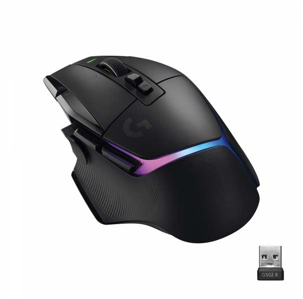 Logitech G G502 X PLUS - LIGHTSPEED Wireless RGB Gaming Mouse. Form factor Right-hand. Movement detection technology Optical, Device interface RF Wireless, Movement resolution 25600 DPI, Buttons type Pressed buttons, Buttons quantity 13, Scroll type Wheel, Acceleration (max) 40 G. Illumination colour Multi. Power source Batteries. Product colour Black