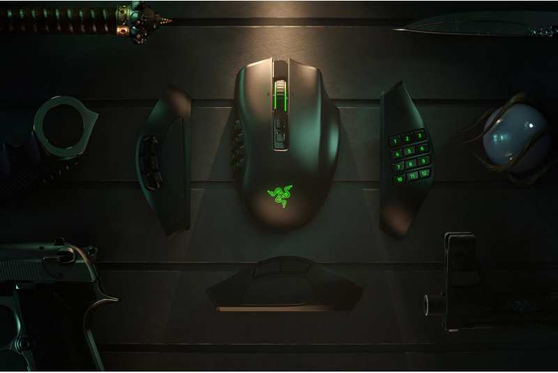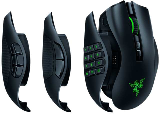 Razer Naga Pro. Form factor Right-hand. Movement detection technology Optical, Device interface RF Wireless, Movement resolution 20000 DPI, Buttons type Pressed buttons, Buttons quantity 20, Scroll type Trackball. Illumination colour Green. Power source Batteries/Cable. Product colour Black
