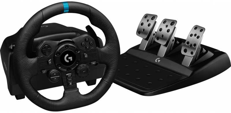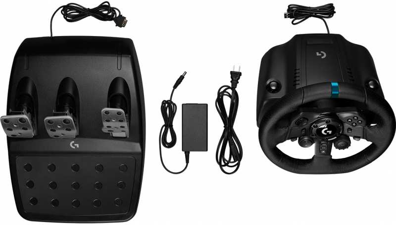 Logitech G G923. Device type Steering wheel + Pedals, Gaming platforms supported PC, PlayStation 4, Steering wheel rotation angle 900°. Connectivity technology Wired, Device interface USB. Product colour Black, Pedals box material Cold rolled steel, Polyoxymethylene (POM), Stainless steel, Steering wheel material Aluminium, Leather, Stainless steel, Steel. Power source Cable. Minimum storage drive space 150 MB