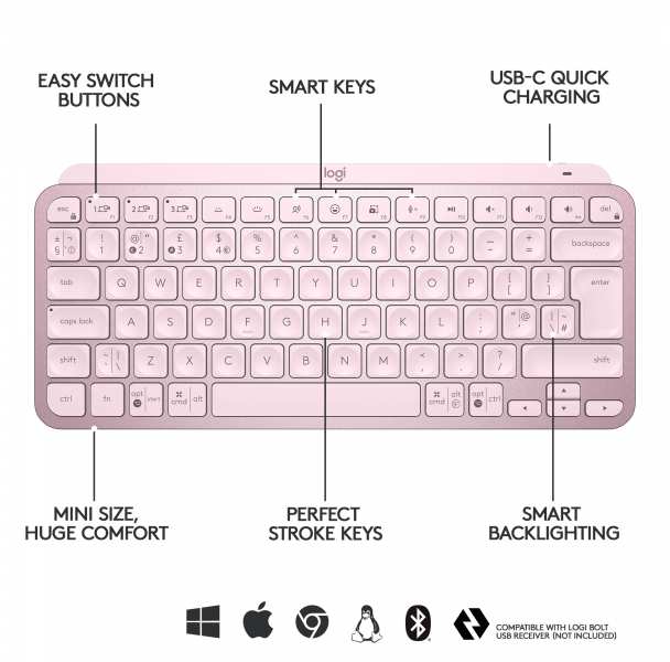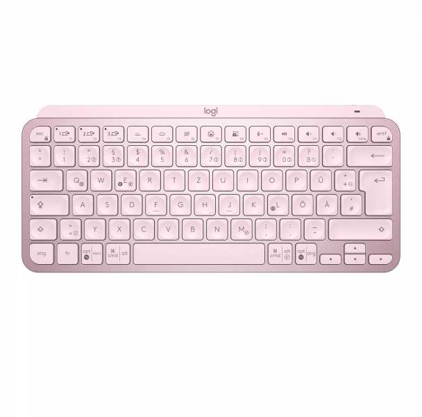 Logitech MX Keys Mini Minimalist Wireless Illuminated Keyboard. Keyboard form factor Mini. Keyboard style Straight. Device interface RF Wireless + Bluetooth, Keyboard layout QWERTZ. Backlight type LED. Recommended usage Office. Product colour Pink