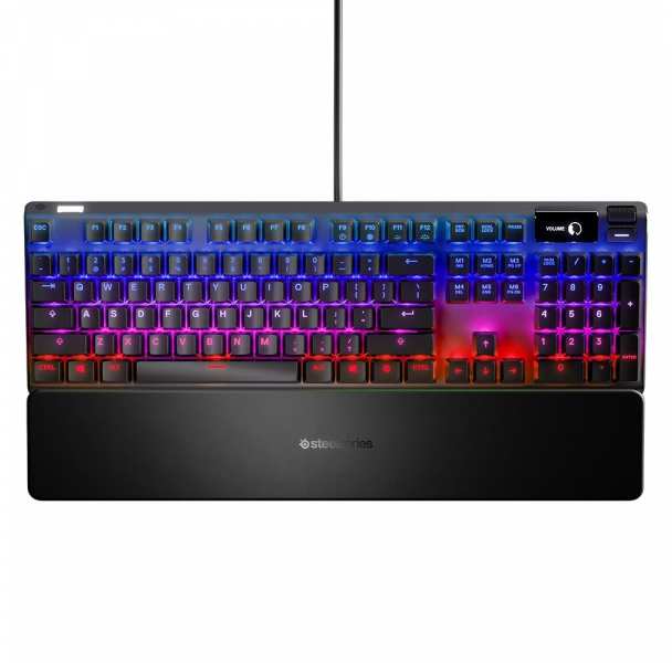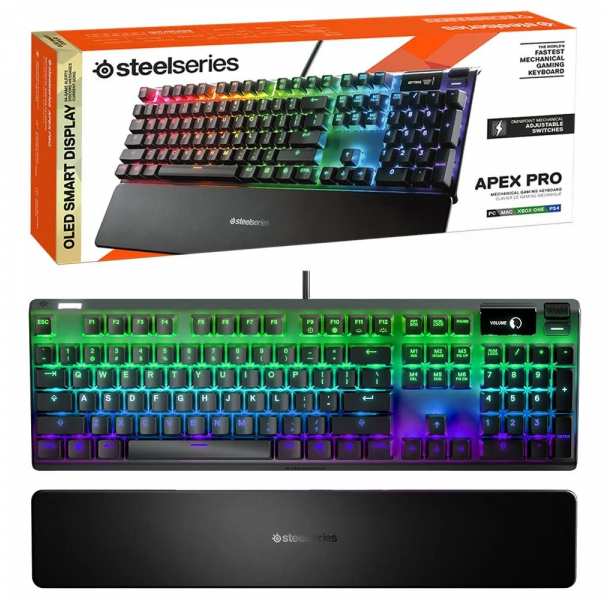 Steelseries APEX PRO. Keyboard form factor Full-size (100%). Keyboard style Straight. Device interface USB, Keyboard key switch Mechanical, Keyboard layout QWERTY, Keyboard number of keys 107. Backlight type RGB LED, Wrist rest. Recommended usage Gaming. Product colour Black