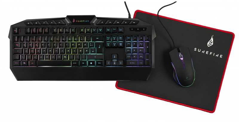Keyboard Dimensions L x W x H (mm) 469 mm x 206 mm x 38 mm Cable length 1.8 m Key technology membrane Size type full size Connection type Wired Connection type USB-A Programmable RGB lighting 2 active modes (switching cycle and pulsating) 8 static modes (7 colours and rainbow colours) Customisable backlighting - 6 areas Adjustable lighting intensity - 5 levels Adjustable speed - 4 speeds Height adjustable yes Keycaps 115 keys (QWERTZ / German) Multimedia keys 10 multimedia keys N-key rollover 25 anti-ghosting keys Key life 10 million keystrokes Response time ?8 ms Key travel 0.1 mm Product material Extremely durable ABS plastic Compatible software platforms Windows, Mac OS, Chrome OS Compatible device types PC, laptop, game console Mouse Dimensions W x L x H 130 mm x 69 mm x 42 mm Form factor Palm Grip for right-handers Number of buttons 7 Buttons Left, Right, Middle, DPI +, DPI-, Forward, Backward buttons Sensor optical sensor Resolution (DPI) 1200-1600-2000-3200 DPI (4 DPI levels) Lifespan 3 million clicks Acceleration 70 +/- 10 G Sensor speed (max.) 6000 FPS Scanning speed 66 IPS Lighting Entire RGB spectrum Connection type Wired Cable length 1.50 m Cable type Braided jacket Connector USB Plug & Play Compatibility PC, laptop, Mac, consoles with USB port Mousepad Size Medium Dimensions W x L x H (mm) 320 mm x 260 mm x 3 mm Mouse pad type Soft Material type Polyester fibre and natural rubber RGB lighting No.