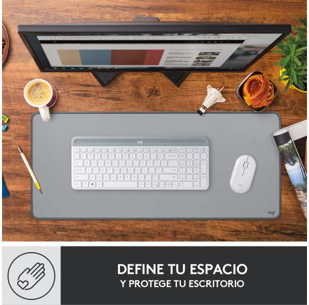 Logitech Desk Mat Studio Series. Width 700 mm, Depth 300 mm. Product colour Grey, Surface coloration Monochromatic, Material Nylon, Polyester, Rubber, Stitched edges, Non-slip base