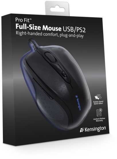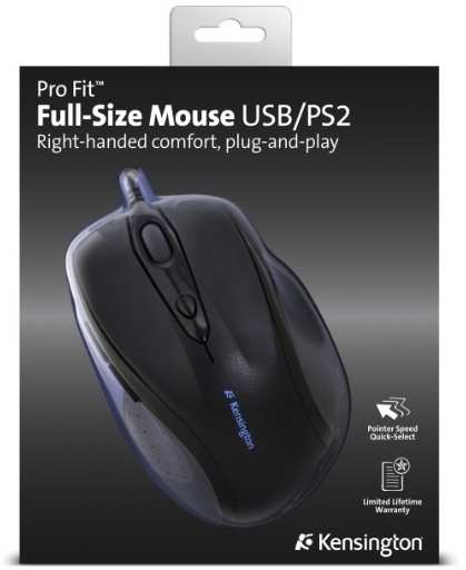 Kensington Pro Fit Wired Full-Size Mouse. Movement detection technology Optical, Device interface USB+PS/2, Movement resolution 2400 DPI, Buttons type Pressed buttons, Buttons quantity 5, Scroll type Wheel. Product colour Black
