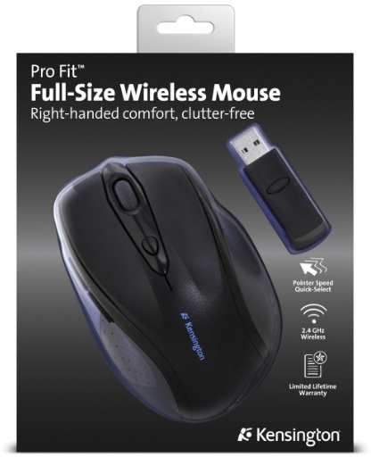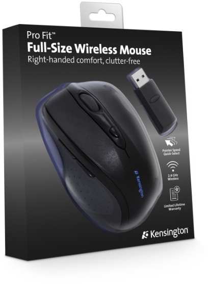 Kensington Pro Fit Wireless Full-Size Mouse. Movement detection technology Optical, Device interface RF Wireless, Buttons type Pressed buttons, Buttons quantity 5, Scroll type Wheel. Product colour Black
