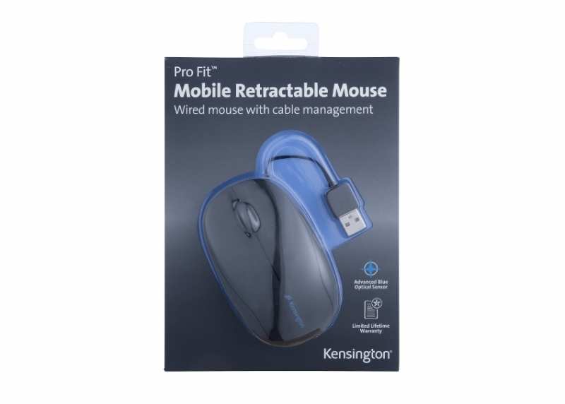 Kensington Pro Fit Retractable Mobile Mouse. Movement detection technology Optical, Device interface USB, Buttons type Pressed buttons, Buttons quantity 3, Scroll type Wheel. Product colour Black