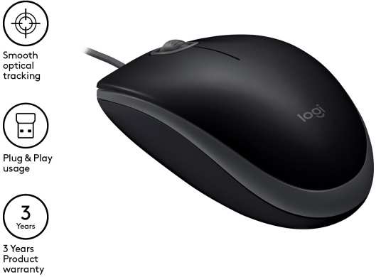 Logitech B110. Form factor Ambidextrous. Movement detection technology Optical, Device interface USB, Movement resolution 1000 DPI, Buttons type Pressed buttons, Buttons quantity 3, Scroll type Wheel. Power source Cable. Product colour Black