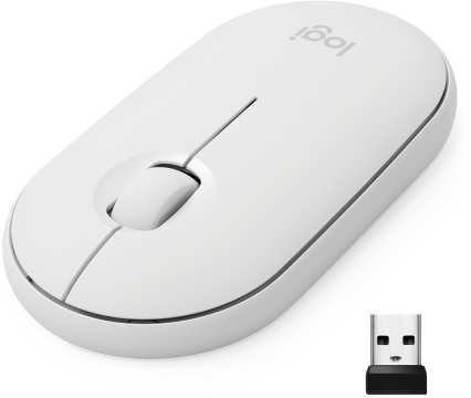 Logitech Pebble M350. Form factor Ambidextrous. Movement detection technology Optical, Device interface RF Wireless+Bluetooth, Movement resolution 1000 DPI, Buttons type Pressed buttons, Buttons quantity 3, Scroll type Wheel. Power source Batteries. Product colour White