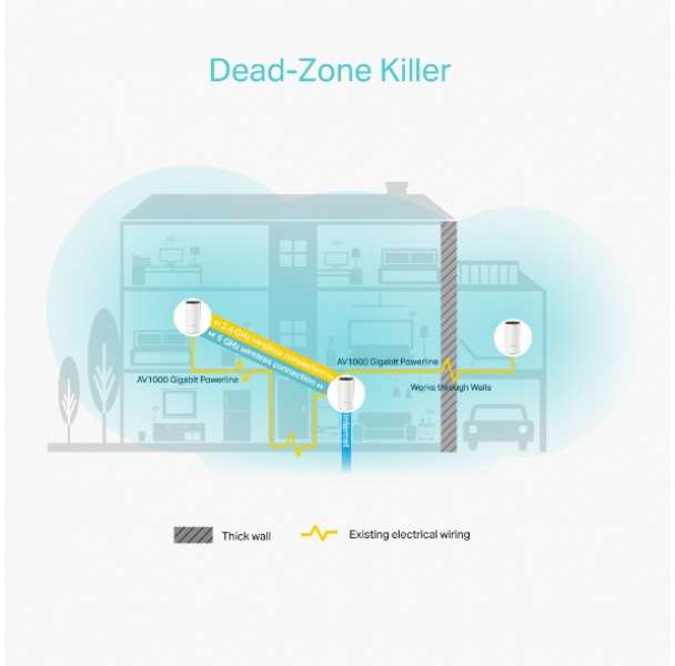TP-LINK AC1200 + AV1000 Whole Home Hybrid Mesh Wi-Fi System. Housing colour White, Antenna type Internal, Operating temperature (T-T) 0 - 40 °C. Wi-Fi band Dual-band (2.4 GHz / 5 GHz), Top Wi-Fi standard Wi-Fi 5 (802.11ac), Wi-Fi standards 802.11a,802.11b,802.11g,Wi-Fi 4 (802.11n),Wi-Fi 5 (802.11ac). Firewall security SPI. Width 190 mm, Depth 90.7 mm, Height 90.7 mm
