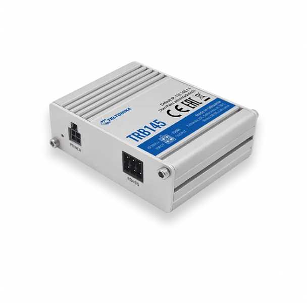 Teltonika TRB145. Cable types supported Cat1. SIM card type MiniSIM, Serial interface type RS-485. Width 60 mm, Depth 70 mm, Height 18 mm. DC input voltage 9 - 30 V. Internal memory 128 MB, Flash memory 512 MB