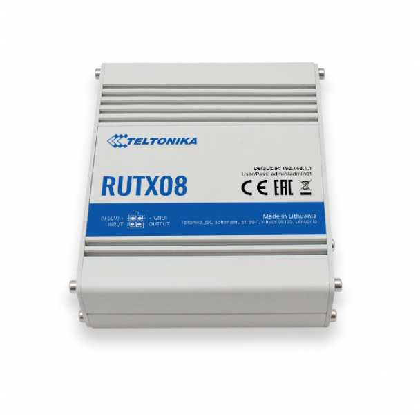 Teltonika RUTX08. Networking standards IEEE 802.3, IEEE 802.3az, IEEE 802.3u, Ethernet interface type Gigabit Ethernet, Cabling technology 10/100/1000Base-T(X). VoIP protocols H.232, Supported network protocols TCP, UDP, IPv4, IPv6, ICMP, NTP, DNS, HTTP, HTTPS, FTP, SMTP, SSL v3, TLS, ARP, VRRP, PPP, PPPoE,.... Security algorithms SSH, SSH-2. Product colour Grey, Housing material Aluminium, LED indicators Power, Status. Power source type DC