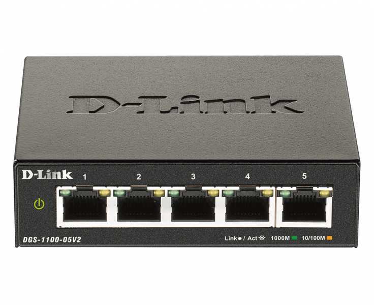 D-Link DGS-1100-05V2. Switch type Managed, Switch layer L2. Basic switching RJ-45 Ethernet ports type Gigabit Ethernet (10/100/1000), Basic switching RJ-45 Ethernet ports quantity 5. Switching capacity 10 Gbit/s. DC input voltage 5 V