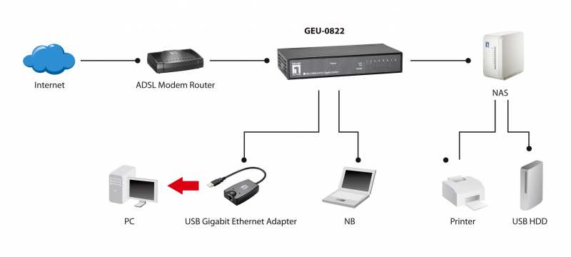 LevelOne 8-Port Gigabit Switch. Switch type Unmanaged. Basic switching RJ-45 Ethernet ports type Gigabit Ethernet (10/100/1000), Basic switching RJ-45 Ethernet ports quantity 8. MAC address table 8192 entries, Switching capacity 16 Gbit/s. Networking standards IEEE 802.3,IEEE 802.3ab,IEEE 802.3az,IEEE 802.3u. Power connector DC-in jack