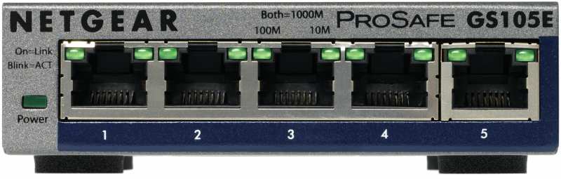 Netgear GS105E-200PES. Switch type Managed, Switch layer L2/L3. Basic switching RJ-45 Ethernet ports type Gigabit Ethernet (10/100/1000), Basic switching RJ-45 Ethernet ports quantity 5. Full duplex. MAC address table 8000 entries, Switching capacity 10 Gbit/s. Networking standards IEEE 802.1p,IEEE 802.1Q,IEEE 802.3,IEEE 802.3ab,IEEE 802.3af,IEEE 802.3i,IEEE 802.3u,IEEE 802.3x