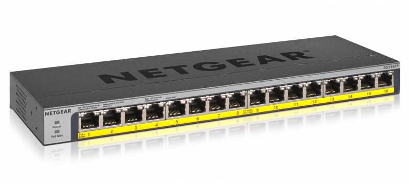 Netgear GS116PP. Switch type Unmanaged. Basic switching RJ-45 Ethernet ports type Gigabit Ethernet (10/100/1000), Basic switching RJ-45 Ethernet ports quantity 16. MAC address table 4000 entries, Switching capacity 32 Gbit/s. Networking standards IEEE 802.1p,IEEE 802.3af,IEEE 802.3at,IEEE 802.3az,IEEE 802.3x. DC input voltage 54 V. Power over Ethernet (PoE). Rack mounting