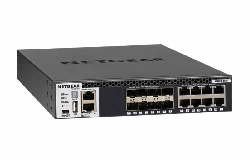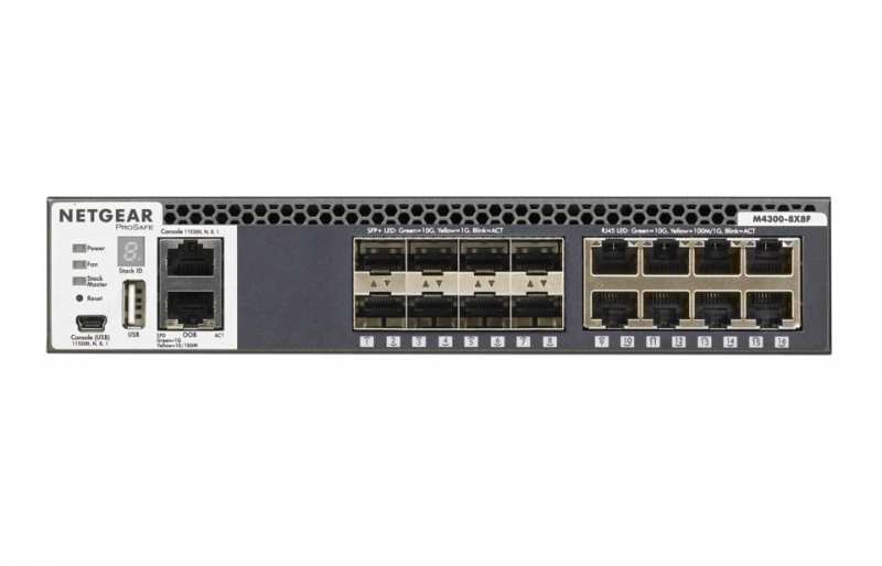 Netgear M4300-8X8F. Switch type Managed, Switch layer L3. Basic switching RJ-45 Ethernet ports type 10G Ethernet (100/1000/10000), Basic switching RJ-45 Ethernet ports quantity 8, USB 2.0 ports quantity 1, Console port RJ-45/Mini-USB. MAC address table 16000 entries, Switching capacity 320 Gbit/s. Networking standards IEEE 802.11ad,IEEE 802.11az,IEEE 802.3ad,IEEE 802.3az. Rack mounting, Form factor 1U
