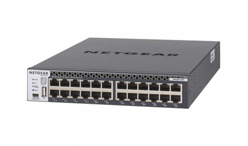 Netgear M4300-24X. Switch type Managed, Switch layer L3. Basic switching RJ-45 Ethernet ports type 10G Ethernet (100/1000/10000), Basic switching RJ-45 Ethernet ports quantity 24, USB 2.0 ports quantity 2, Console port RJ-45. MAC address table 16000 entries, Switching capacity 480 Gbit/s. Networking standards IEEE 802.1AX,IEEE 802.3ad,IEEE 802.3aq,IEEE 802.3az. Power connector DC-in jack. Rack mounting, Form factor 1U