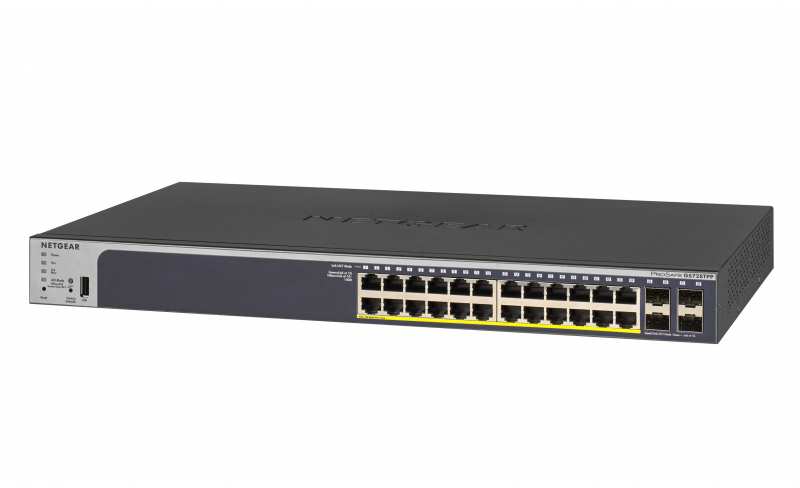 Netgear GS728TPP. Switch type Managed, Switch layer L2/L3/L4. Basic switching RJ-45 Ethernet ports type Gigabit Ethernet (10/100/1000), Basic switching RJ-45 Ethernet ports quantity 24, Installed SFP modules quantity 4, USB 2.0 ports quantity 1. MAC address table 16000 entries, Switching capacity 56 Gbit/s. Power over Ethernet (PoE). Rack mounting, Form factor 1U