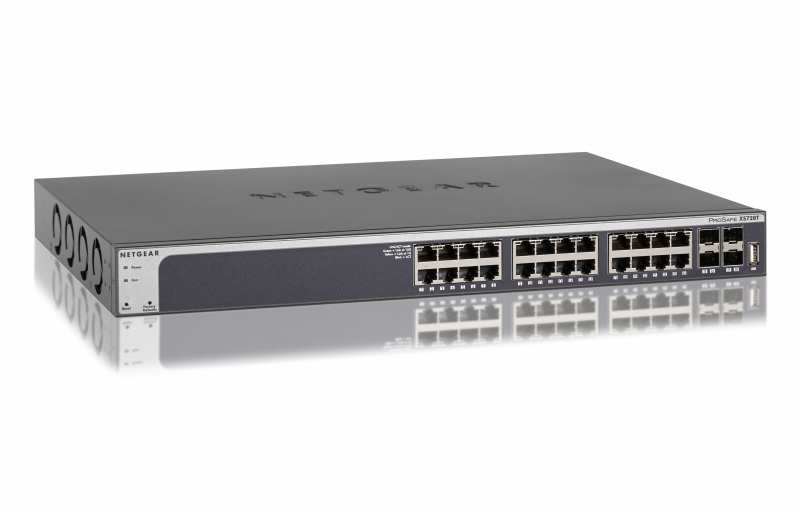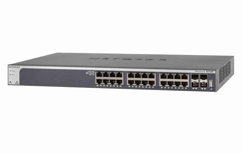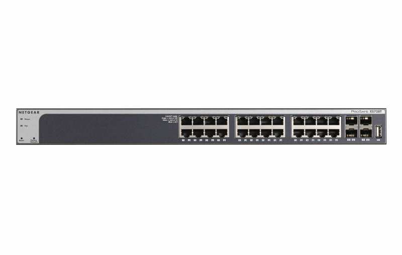 Netgear XS728T. Switch type Managed, Switch layer L2+/L3. Basic switching RJ-45 Ethernet ports type 10G Ethernet (100/1000/10000), Basic switching RJ-45 Ethernet ports quantity 24, Installed SFP+ modules quantity 4, USB 2.0 ports quantity 1. Full duplex. MAC address table 16000 entries, Switching capacity 560 Gbit/s. Networking standards IEEE 802.1D,IEEE 802.1Q,IEEE 802.1ab,IEEE 802.1p,IEEE 802.1s,IEEE 802.1w,IEEE 802.1x,IEEE.... Rack mounting