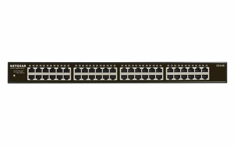 Netgear GS348. Switch type Unmanaged. Basic switching RJ-45 Ethernet ports type Gigabit Ethernet (10/100/1000), Basic switching RJ-45 Ethernet ports quantity 48, Console port RJ-45. MAC address table 16000 entries, Switching capacity 96 Gbit/s. Networking standards IEEE 802.1p,IEEE 802.3,IEEE 802.3ab,IEEE 802.3az,IEEE 802.3i,IEEE 802.3u,IEEE 802.3x. Power connector DC-in jack. Rack mounting, Form factor 1U