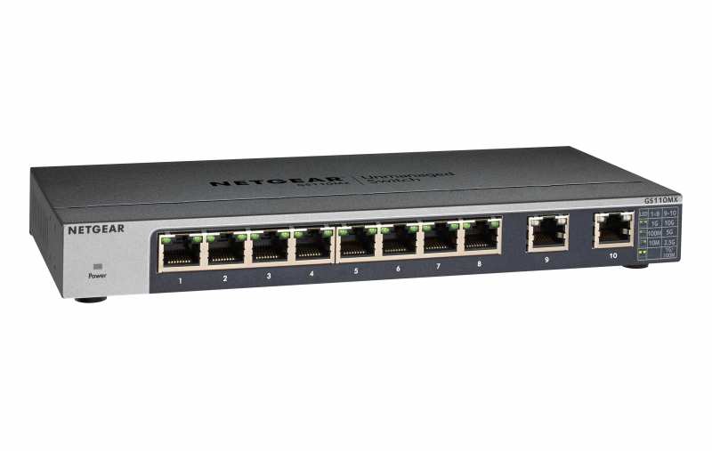 Netgear GS110MX. Switch type Unmanaged. Basic switching RJ-45 Ethernet ports type 10G Ethernet (100/1000/10000), Basic switching RJ-45 Ethernet ports quantity 10, Console port RJ-45. MAC address table 16000 entries, Switching capacity 56 Gbit/s. Networking standards IEEE 802.1p,IEEE 802.3x. DC input voltage 13.2 V. Power connector DC-in jack. Rack mounting