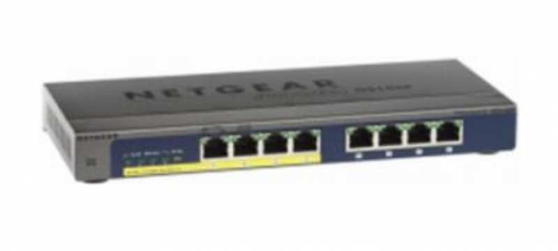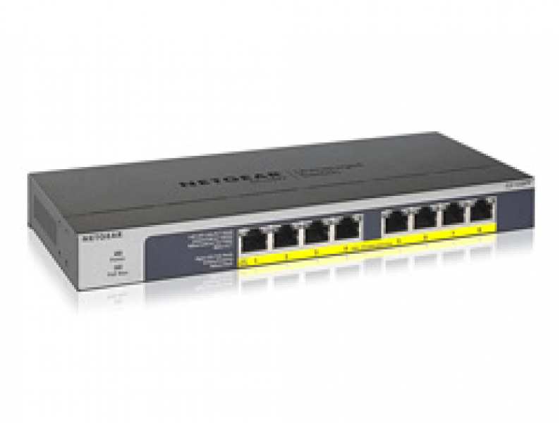 Netgear GS108PP. Switch type Unmanaged. Basic switching RJ-45 Ethernet ports type Gigabit Ethernet (10/100/1000), Basic switching RJ-45 Ethernet ports quantity 8. Full duplex. MAC address table 4000 entries, Switching capacity 16 Gbit/s. Networking standards IEEE 802.1p,IEEE 802.3af,IEEE 802.3at,IEEE 802.3az,IEEE 802.3x. DC input voltage 54 V. Power over Ethernet (PoE). Wall mountable, Rack mounting
