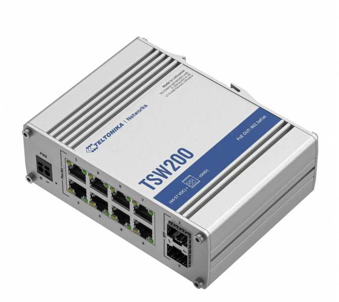Teltonika TSW200. Switch type Unmanaged. Basic switching RJ-45 Ethernet ports type Gigabit Ethernet (10/100/1000), Basic switching RJ-45 Ethernet ports quantity 8. MAC address table 2000 entries. Networking standards IEEE 802.3, IEEE 802.3af, IEEE 802.3at, IEEE 802.3az, IEEE 802.3u. DC input voltage 7 - 57 V. Power over Ethernet (PoE). Wall mountable, Rack mounting