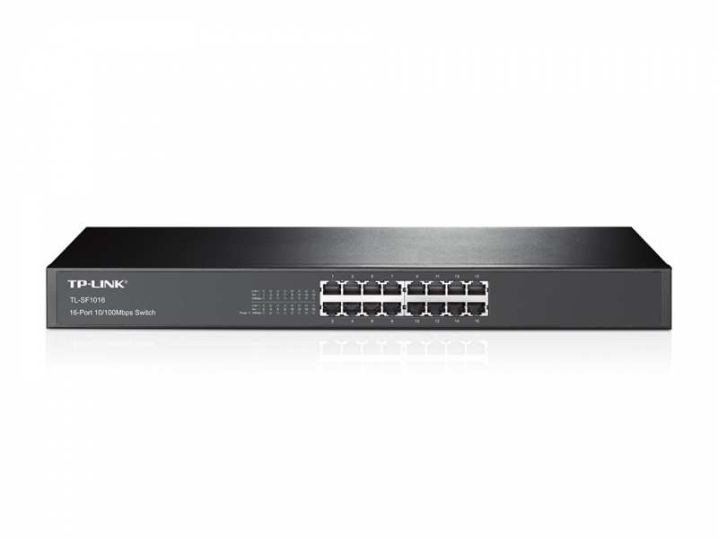 TP-LINK 16-Port 10/100Mbps Rackmount Network Switch. Switch type Unmanaged. Basic switching RJ-45 Ethernet ports type Fast Ethernet (10/100), Basic switching RJ-45 Ethernet ports quantity 16, Console port RJ-45. MAC address table 8000 entries, Switching capacity 3.2 Gbit/s. Networking standards IEEE 802.3i,IEEE 802.3u,IEEE 802.3x. Power connector DC-in jack. Rack mounting, Form factor 1U