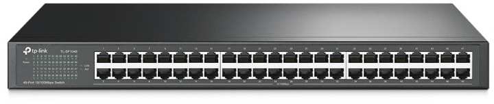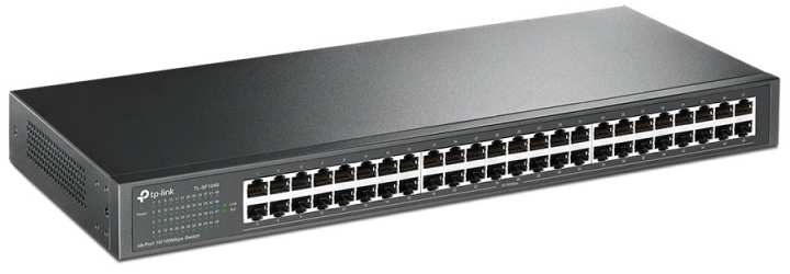 TP-Link TL-SF1048. Switch type Unmanaged. Basic switching RJ-45 Ethernet ports type Fast Ethernet (10/100), Basic switching RJ-45 Ethernet ports quantity 48. MAC address table 8000 entries, Switching capacity 96 Gbit/s. Networking standards IEEE 802.3, IEEE 802.3ab, IEEE 802.3u, IEEE 802.3x. Power connector DC-in jack. Rack mounting, Form factor 1U