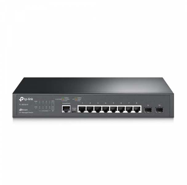 TP-LINK JetStream 8-Port Gigabit L2+ Managed Switch with 2 SFP Slots. Switch type Managed, Switch layer L2. Basic switching RJ-45 Ethernet ports type Gigabit Ethernet (10/100/1000), Basic switching RJ-45 Ethernet ports quantity 8, Console port RJ-45/micro-USB. MAC address table 8000 entries, Switching capacity 20 Gbit/s. Networking standards IEEE 802.1D,IEEE 802.1Q,IEEE 802.1p,IEEE 802.1s,IEEE 802.1w,IEEE 802.1x,IEEE 802.3ab,IEEE.... Rack mounting