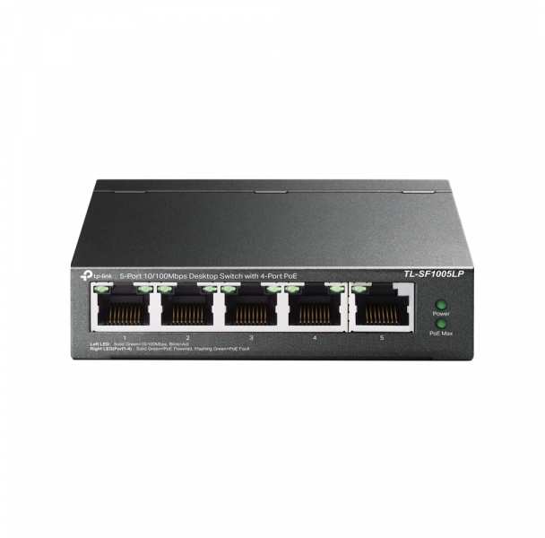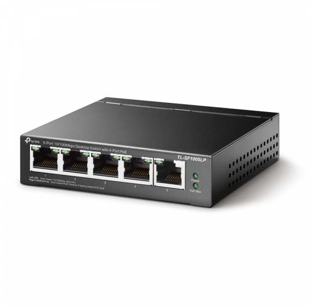 TP-LINK 5-Port 10/100Mbps Desktop Switch with 4-Port PoE. Switch type Unmanaged. Basic switching RJ-45 Ethernet ports type Fast Ethernet (10/100), Basic switching RJ-45 Ethernet ports quantity 5. MAC address table 2000 entries, Switching capacity 1 Gbit/s. Networking standards IEEE 802.3af,IEEE 802.3i,IEEE 802.3u,IEEE 802.3x. DC input voltage 53.5 V. Power over Ethernet (PoE)