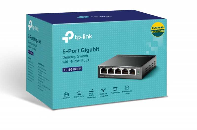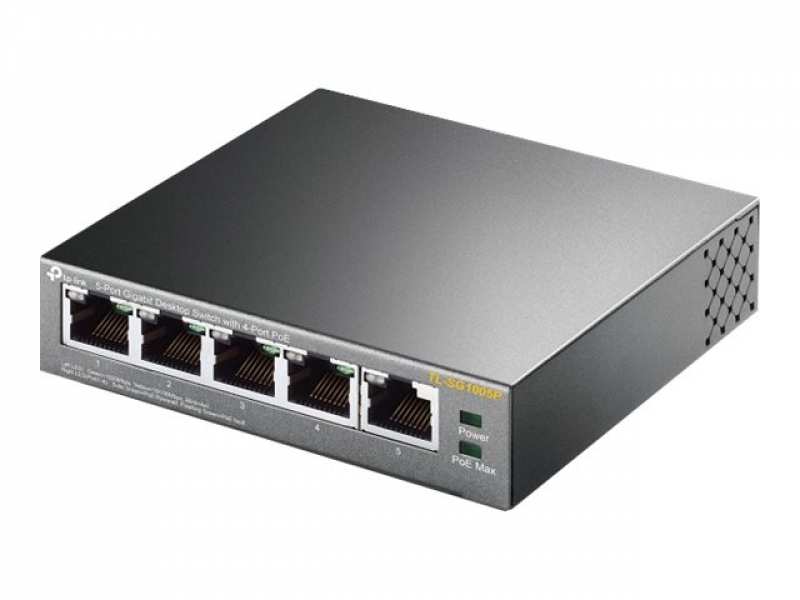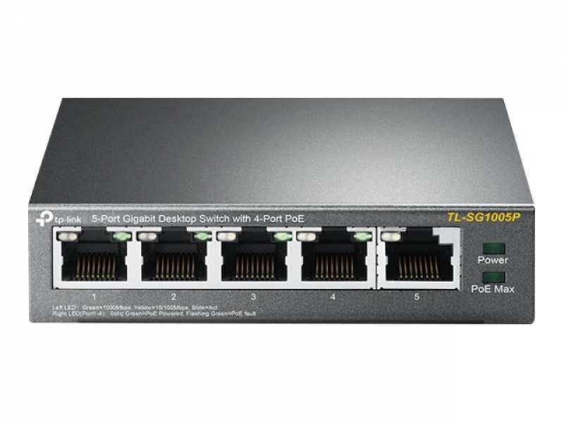TP-LINK TL-SG1005P. Switch type Unmanaged. Basic switching RJ-45 Ethernet ports type Gigabit Ethernet (10/100/1000), Basic switching RJ-45 Ethernet ports quantity 5. MAC address table 2000 entries, Switching capacity 10 Gbit/s. Networking standards IEEE 802.1p,IEEE 802.3af,IEEE 802.3x. Power over Ethernet (PoE)
