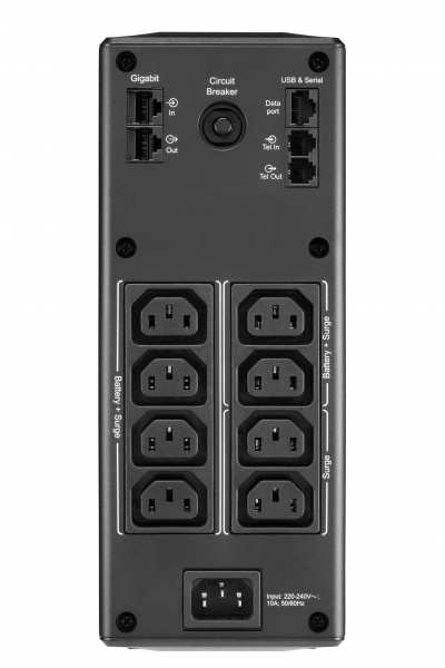 Other features Nominal output voltage 230 V Nominal input voltage 230 V Ports & interfaces AC outlets quantity 8 AC outlet(s) Power plug C14 coupler AC outlet types C13 coupler USB 2.0 ports quantity 1 Ethernet LAN (RJ-45) ports 2 Cabling technology 10/100/1000Base-T(X) USB port Y Design Cooling type Passive Product colour Black Cable length 1.83 m Certification A-tick, C-tick, CE, EAC, GS Mark, RCM, TISI LED indicators Y Form factor Tower Display LCD Weight & dimensions Depth 382 mm Weight 10.2 kg Height 100 mm Width 250 mm Battery Battery recharge time 16 h Battery technology Sealed Lead Acid (VRLA) Automatic battery test Y Hot-swap battery Y Battery life (max) 5 year(s) Cold start Y Features Waveform Sine Input frequency 50/60 Hz Audible alarm modes Alarm when on battery,Low battery alarm,Overload alarm Output power capacity 1300 VA Output power 780 W ECO mode Y Input operation voltage (min) 176 V Surge protection Y UPS topology Line-Interactive Maximum current 10 A Audible alarm(s) Y Output frequency 50/60 Hz Noise level 45 dB Surge protection features Network Surge energy rating 509 J Input operation voltage (max) 294 V Automatic Voltage Regulation (AVR) Y Operational conditions Storage relative humidity (H-H) 0 - 95 % Storage temperature (T-T) -15 - 45 °C Non-operating altitude 0 - 15000 m Operating temperature (T-T) 0 - 40 °C Operating relative humidity (H-H) 0 - 95 % Operating altitude 0 - 3000 m Packaging data Package depth 225 mm Manual Y Package height 330 mm Cables included USB cable Package width 485 mm Package weight 11.8 kg
